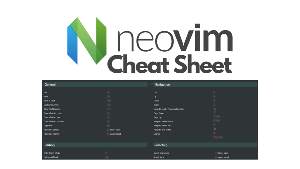 This is a free Notion cheat sheet that contains helpful keyboard shortcuts and tips for using Neovim.